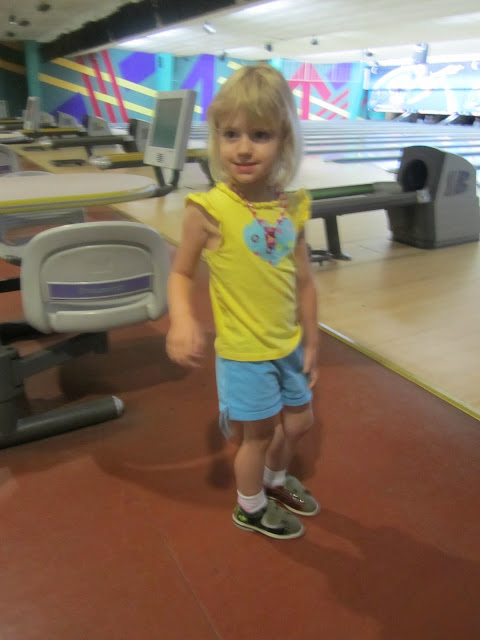 Today, while Hannah was in school (her last day is next Wednesday!), Sadie and I went bowling with friends. She slowly warmed up and got the hang of it!